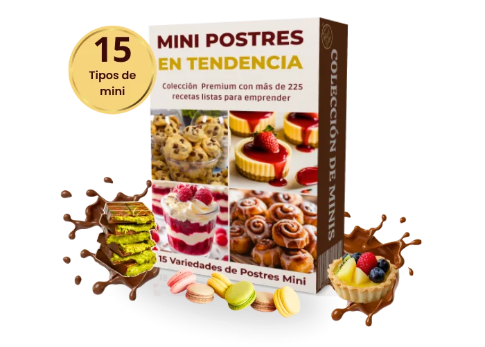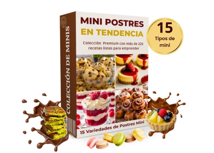 Accede Hoy a una colección única con +225 Recetas Descargables de Mini Postres en Tendencia con bonos prácticos que transformarán tu catálogo en una vitrina premium 🧁